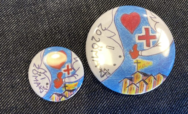 オリジナル缶バッジの製作です!今回お客様手書きのイラストをスキャンニング、その後フォトショップで画像調整後バッジに仕上げてます。大きさ32mmと56mmの2種。バッジ以外にも同じ仕様でマグネット製作も可能です!一個から作っており…
