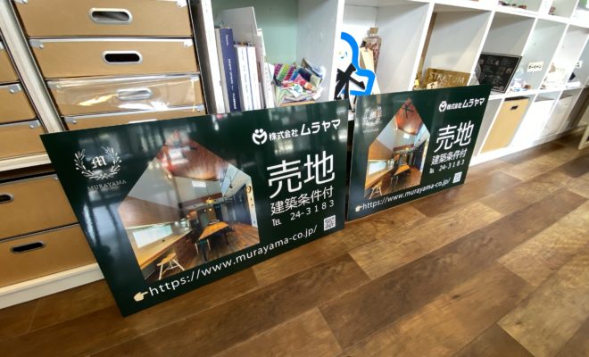 ご近所の工務店さん、ムラヤマ様のパネルサインです。うちもムラヤマさんに店舗建てて頂きました。濃グリーンの背景がおしゃれな売地看板の完成です!…